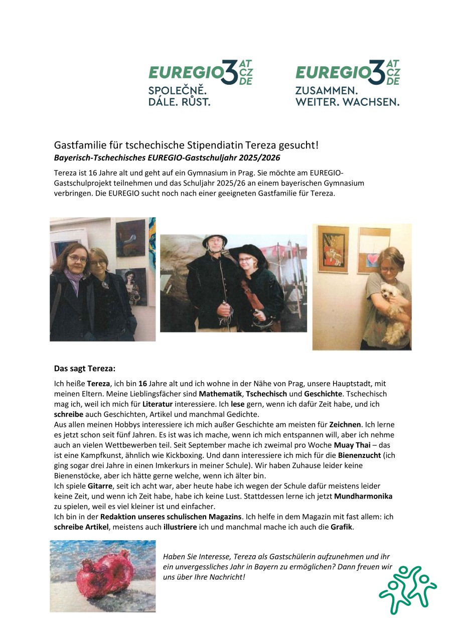 Haben Sie Interesse, einen der Schüler bei sich aufzunehmen und ihnen die bayerische Kultur näherzubringen? Dann wenden Sie sich gerne an L.dreher@euregio-bayern.de oder telefonisch unter +49 151 46 24 45 92. Die EUREGIO freut sich auf Ihre Unterstützung!