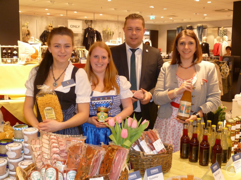 An diesem Tag sollte Adam noch einige Erfahrung im stationären Verkauf sammeln: Zusammen mit Yvonne Klingseis ging er den Mitarbeiterinnen des „Kulinarischen Schaufensters - Schmankerl aus der Region“ zur Hand, die mit einem Stand in der neuen Young Fashion-Abteilung des Kaufhauses vertreten waren. Seit seiner Eröffnung im Frühjahr 2016 steht der „Feinkost-Pavillon“ im ehemaligen Infozentrum Zwiesel an der B 11 für natürliche, ehrliche, heimische Produkte, die man sonst nur verstreut auf unterschiedlichen Bauernmärkten oder in kleinen „Hofläden“ findet. Die ARBERLAND REGio GmbH bietet sämtliche Waren zum Selbstkostenpreis an.