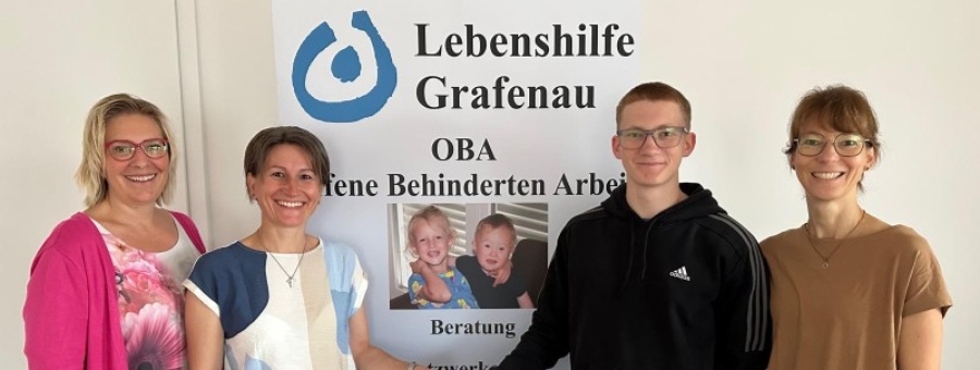 Alexander Fürst übergibt im Namen der Deutsch-Französisch-Klasse des LLG eine Spende an die OBA der Lebenshilfe Grafenau. Mit auf dem Foto: Naglmeier Annette, Daniela Springer und Veronika Fürst (v.l.).