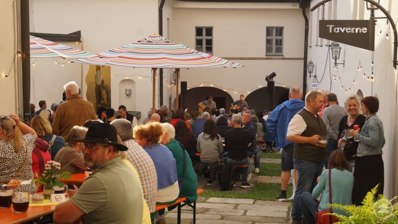 Zahlreiche Besucherinnen und Besucher sitzen im stimmungsvoll beleuchteten Innenhof von Schloss Wolfstein an Bierbänken unter bunten Sonnenschirmen. Im Hintergrund spielen Musiker live auf einer kleinen Bühne.
