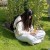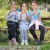 Ein Mädchen sitzt im Gras, lehnt am Baum und schreibt in ein Heft.Drei Kinder sitzen auf einer Bank und essen Eis.