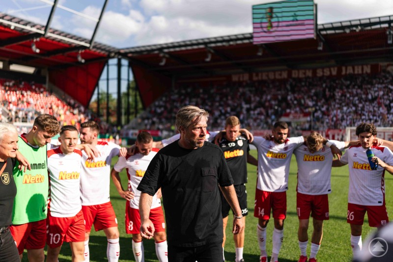 Auf dem Bild ist die Mannschaft des SSV Jahn Regensburg nach einem Spiel im Stadion zu sehen. Die Spieler stehen Arm in Arm im Kreis auf dem Rasen, während ein Mann in schwarzem Shirt – vermutlich der Trainer – davorsteht. Im Hintergrund sind die Tribünen mit vielen Fans gefüllt, und eine große Anzeigetafel zeigt das Vereinslogo.