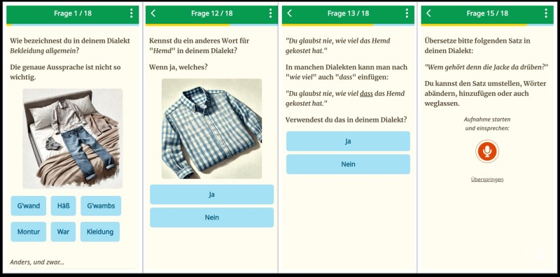 Das erste Bild zeigt mehrere Bildschirmansichten einer App, in der Fragen zu Dialektwörtern gestellt werden. Abgebildet sind Aufgaben, bei denen Begriffe wie Bekleidung oder Hemd in den eigenen Dialekt übersetzt werden sollen, außerdem wird nach bestimmten Satzformen gefragt oder ein Beispielsatz ins Dialektale übertragen. Dazu sind Kleidungsstücke wie Jeans, Hemd oder Pullover als Illustration eingebunden.