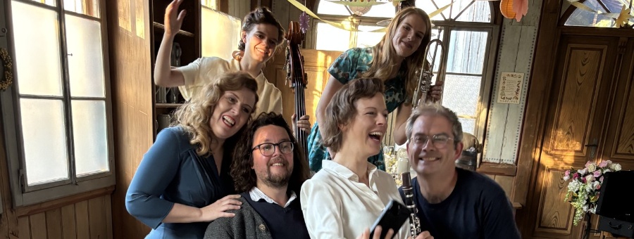 Gute Stimmung beim Dreh im Freilichtmuseum Finsterau – die „Musikgruppe 1957“ mit Regisseur Christian Lex und Komponist Florian Burgmayr.
