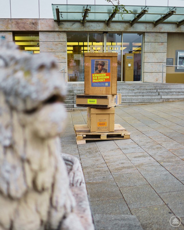 Kunsttransportkisten mit Plakaten am Ludwigsplatz sollen zur Mithilfe bei der Identifizierung von Kunstwerken aufrufen.