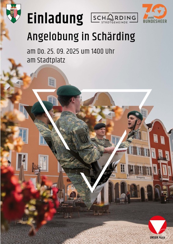 Plakat zur Einladung der Angelobung des österreichischen Bundesheeres am Stadtplatz in Schärding mit Soldaten und Stadtkulisse im Hintergrund.