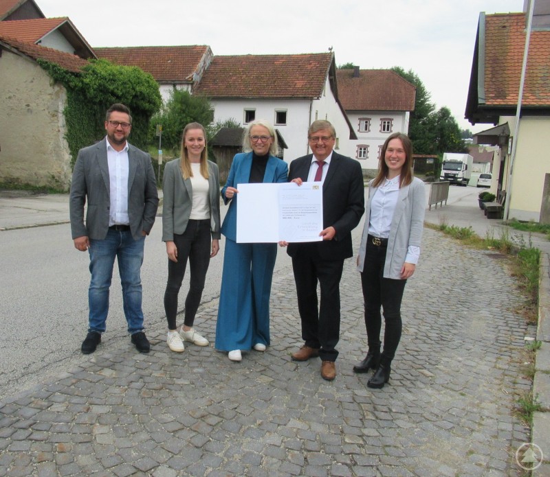 Hans-Peter Schmucker, Leiter des Amts für Ländliche Entwicklung (ALE) Niederbayern (2.v.r.), übergab an Bürgermeisterin Gudrun Donaubauer (Mitte) den Bescheid. Begleitet wurde die Übergabe von (von rechts): Carina Paßreiter (ALE Niederbayern), Stefanie Stemplinger (Bauamt Stadt Hauzenberg) und Leumir Cikaqi (Bauamt Stadt Hauzenberg).
