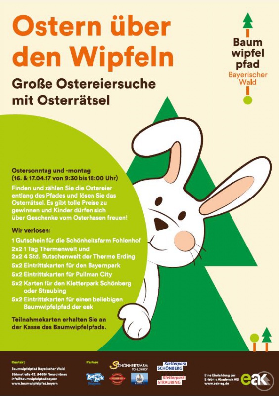 Wie viele Ostereier hat der fleißige Meister Lampe in den Bäumen entlang des Pfads heimlich versteckt? Bei der großen Suche gilt es, alle Eier zu finden und ein spannendes Rätsel zu lösen. Wer die richtige Anzahl der hängenden Ostereier gezählt und die Fragen auf dem Osterrätselfragebogen richtig beantwortet hat, dem winken tolle Preise von Partnern des Baumwipfelpfads! Teilnahmekarten für das Osterrätsel sind an der Kasse erhältlich. Kinder dürfen sich über kleine Geschenke vom Osterhasen freuen, während die Erwachsenen das Frühlingserwachen auf Augenhöhe mit den Baumwipfeln in vollen Zügen genießen können.