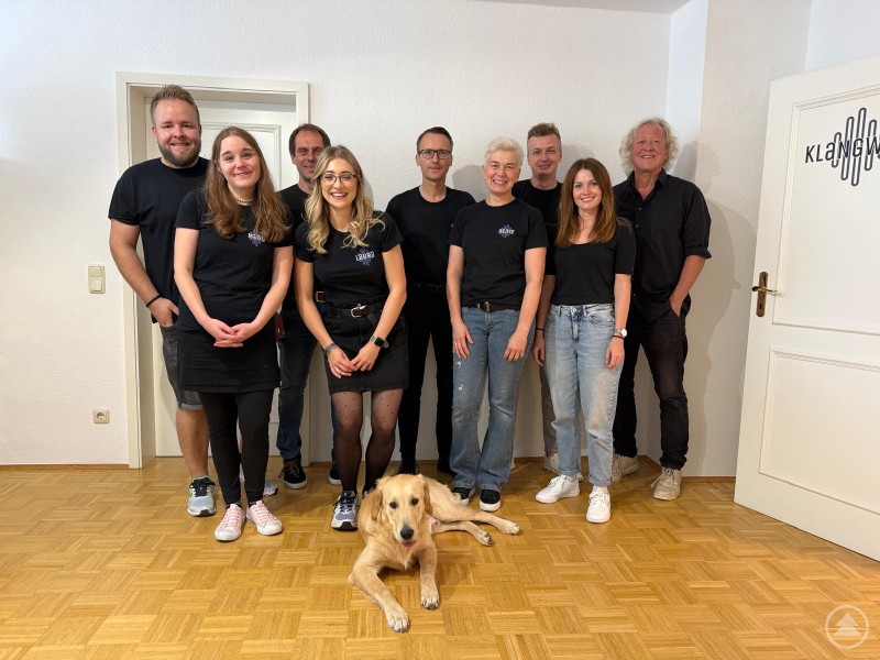 Das Klangwelt-Team freut sich gemeinsam mit Musikschulhund Yoshi über den gelungenen Tag der offenen Tür.