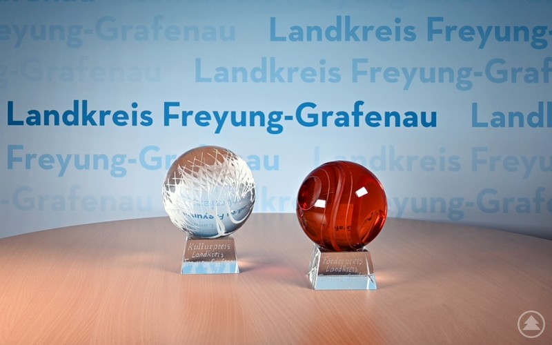 Zwei gläserne Kugel-Trophäen – eine klare und eine rote – stehen auf einem Tisch, im Hintergrund die Beschriftung „Landkreis Freyung-Grafenau“.