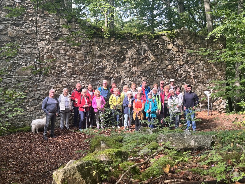 Die gleiche Wandergruppe, erneut vor den Mauerresten der Burgruine, dieses Mal mit mehr grünem Vordergrund sichtbar.