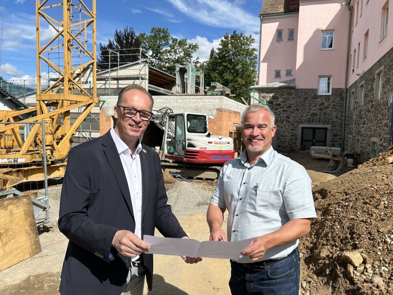 Bürgermeister Michael Herzog erläuterte MdL Martin Behringer die besonderen Herausforderungen beim Umbau der ehemaligen Schulturnhalle in Bayerisch Eisenstein.