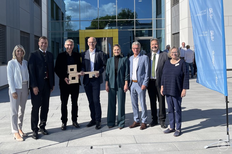 Gruppe von acht Personen steht vor dem modernen Neubau des Bezirksklinikums Mainkofen. Zwei Männer halten einen symbolischen Schlüssel, alle lächeln in die Kamera.
