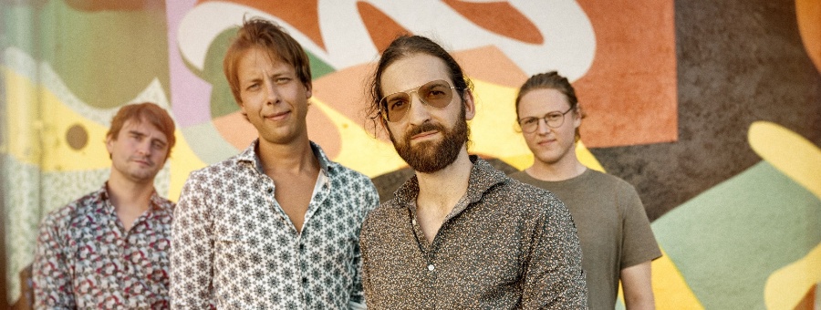 Das Bild zeigt vier Männer, die als Band vor einer bunt bemalten Wand posieren. Sie tragen legere Hemden oder T-Shirts, zwei davon mit auffälligen Mustern. Einer der Männer steht leicht im Vordergrund, trägt Sonnenbrille und hat die Hände in den Hosentaschen.