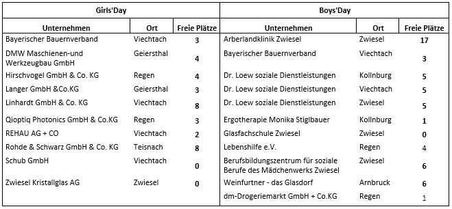 Weitere Informationen zu den einzelnen Angeboten, Firmen und Anmeldeformalitäten findet ihr online unter: www.girls-day.de bzw. www.boys-day.de - oder im Landkreisüberblick unter http://www.arberland-regio.de/de/girls-boys-day/.