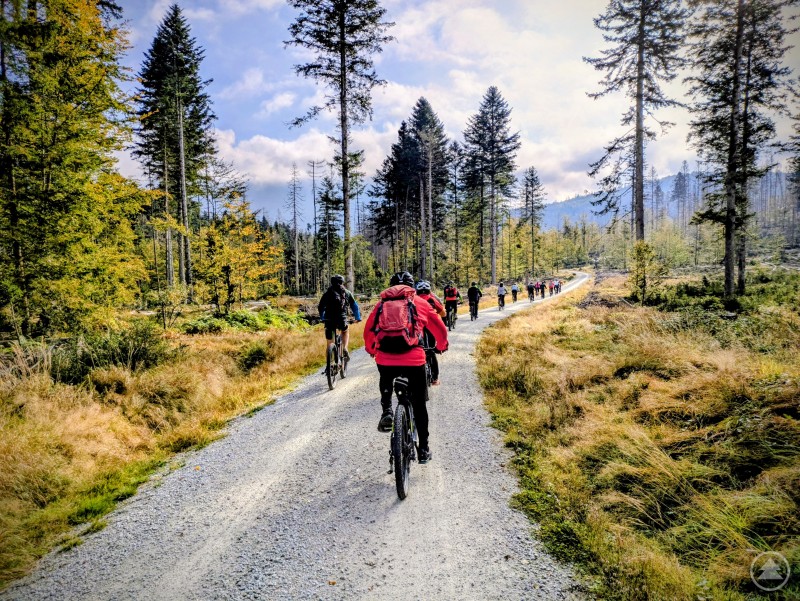 Aufgeteilt in sechs Kleingruppen machten sich die Radler vom Wanderparkplatz in Bayerisch Eisenstein aus auf den Weg, um die Region zugleich sportlich und kulinarisch zu erkunden. Die rund 60 Kilometer lange Strecke führte durch den nördlichen Teil der Ferienregion und eröffnete eindrucksvolle Ausblicke rund um den Falkenstein. Begleitet wurden die Gruppen von ortskundigen Waldführern des Vereins Pro Nationalpark e.V., die mit Wissen und Humor die Besonderheiten entlang der Route erklärten.