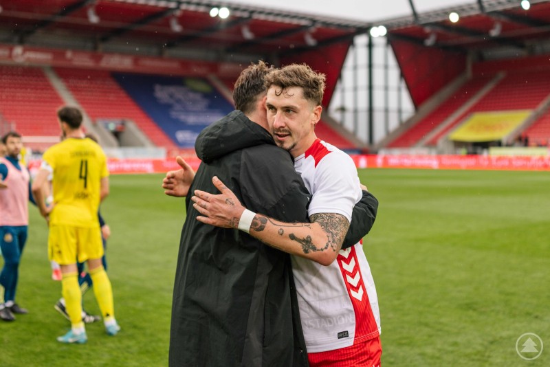 Ein Spieler des SSV Jahn Regensburg umarmt nach dem Spiel eine Person am Spielfeldrand, im Hintergrund sind Spieler des Gegners in gelben Trikots zu sehen.
