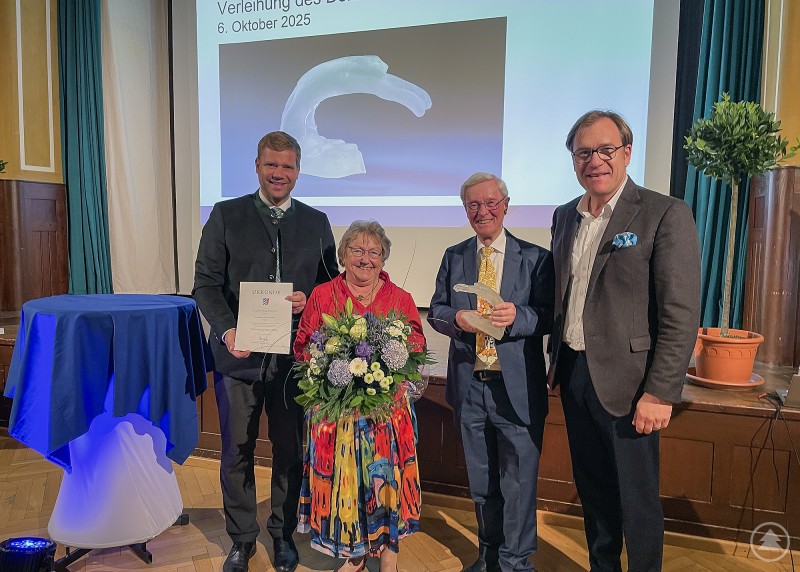 Bezirkstagspräsident Dr. Olaf Heinrich (l.) und Bezirkstagsvizepräsident Dr. Thomas Pröckl (r.) verliehen den Denkmalpreis des Bezirks Niederbayern 2025 an Barbara und Dr. Walter Koch.