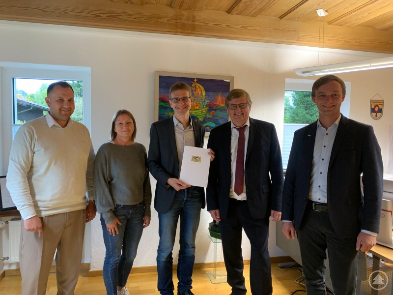 Übergabe des Schlussbescheids (von links): Sebastian Biereder (Geschäftsführer ILE Nationalparkgemeinden e.V.), Claudia Seidl (Bauamt Gemeinde Spiegelau), 1. Bürgermeister Karlheinz Roth, ALE-Leiter Hans-Peter Schmucker und Projektleiter Michael Bartmaier.