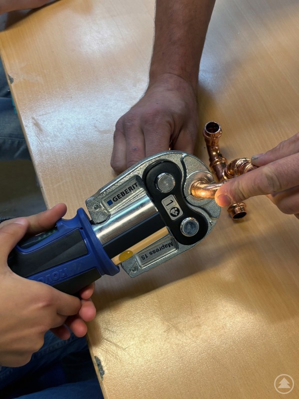 Eine Person hält ein Rohrpresswerkzeug, während eine andere Person ein Kupferrohr fixiert.