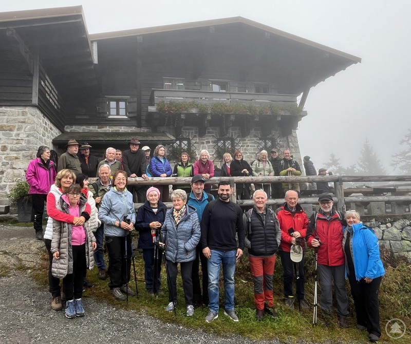 Eine große Wandergruppe steht vor einer urigen Berghütte aus Stein und Holz im Nebel. Die Teilnehmer tragen wetterfeste Kleidung in verschiedenen Farben und lächeln in die Kamera. Im Hintergrund verschwindet die Hütte teilweise im dichten Herbstnebel.