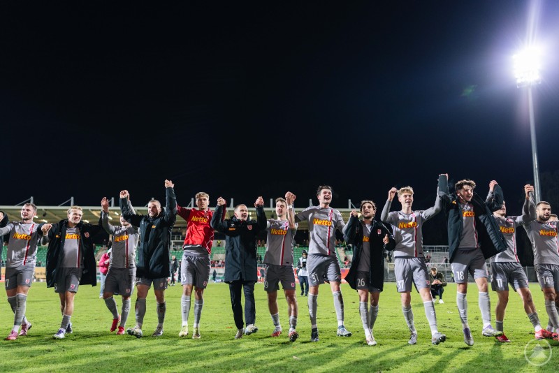 Geschlossene Mannschaftsleistung: Der SSV Jahn Regensburg feiert den 2:1-Auswärtssieg beim TSV Havelse gemeinsam mit den mitgereisten Fans.