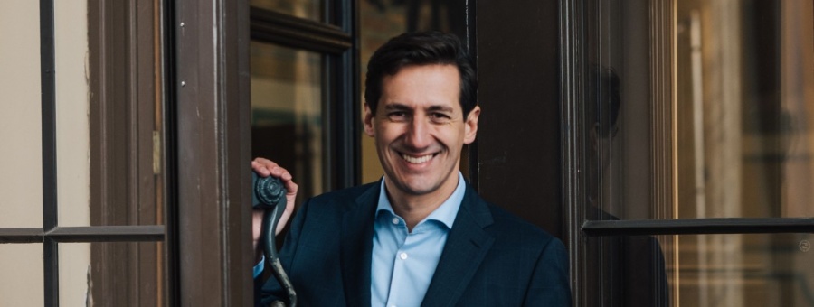 Ein Mann im dunkelblauen Anzug öffnet lächelnd eine große Holztür und blickt freundlich in die Kamera. Er steht in einem historischen Gebäude mit klassischer Architektur.
