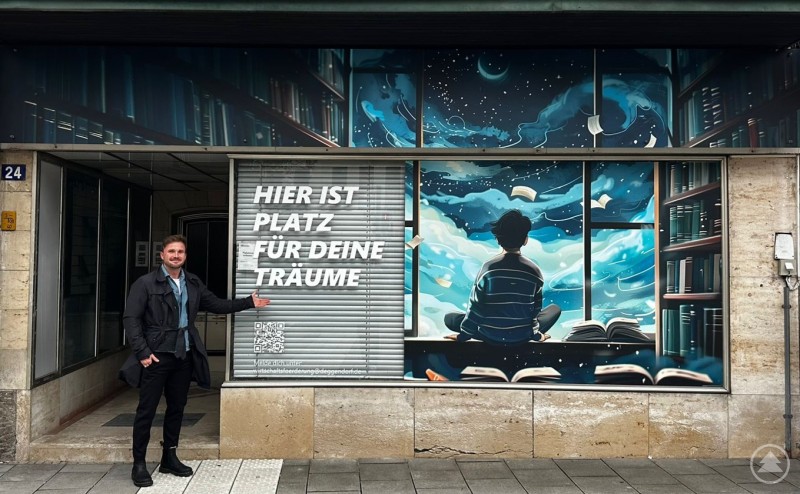 Leerstandsmanager Markus Sandweger vor künstlerisch gestaltetem Schaufenster eines Geschäftsleerstands.