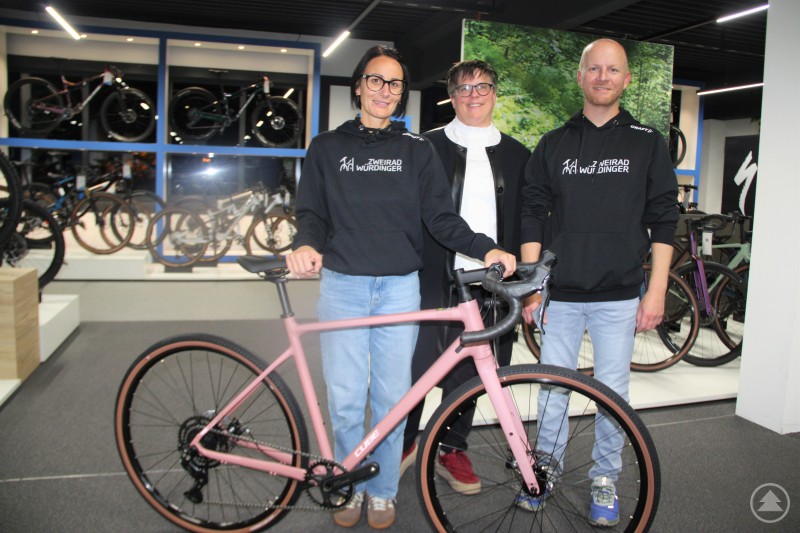 Drei Personen stehen in einem modernen Fahrradgeschäft hinter einem rosafarbenen Rennrad. Im Hintergrund sind zahlreiche weitere Fahrräder ausgestellt.