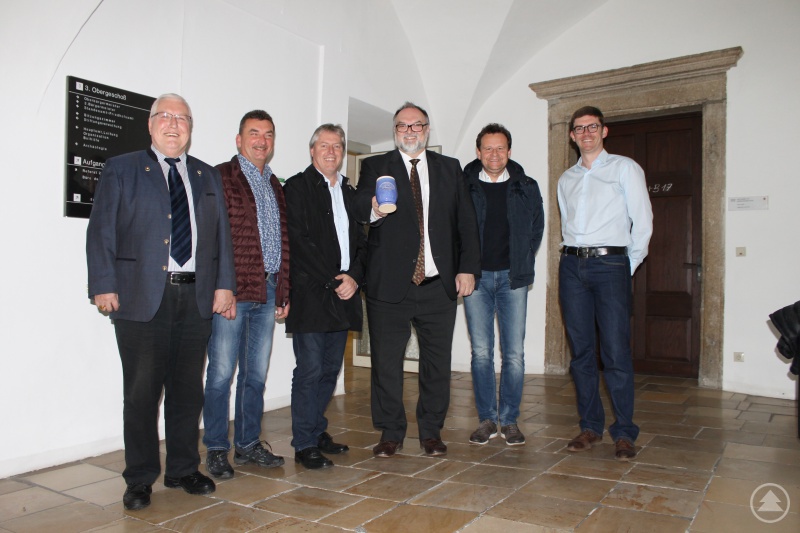 Oberbürgermeister Jürgen Dupper (Foto, 3. von rechts) mit dem neuen Ilzer Haferl, das ihm vom Festkomitee, bestehend aus (von links) Dieter Stephan, Christian Schirmer, Klaus Dichtl, Markus Rohmann und Josef Köck, im Rathaus vorbeigebracht wurde.