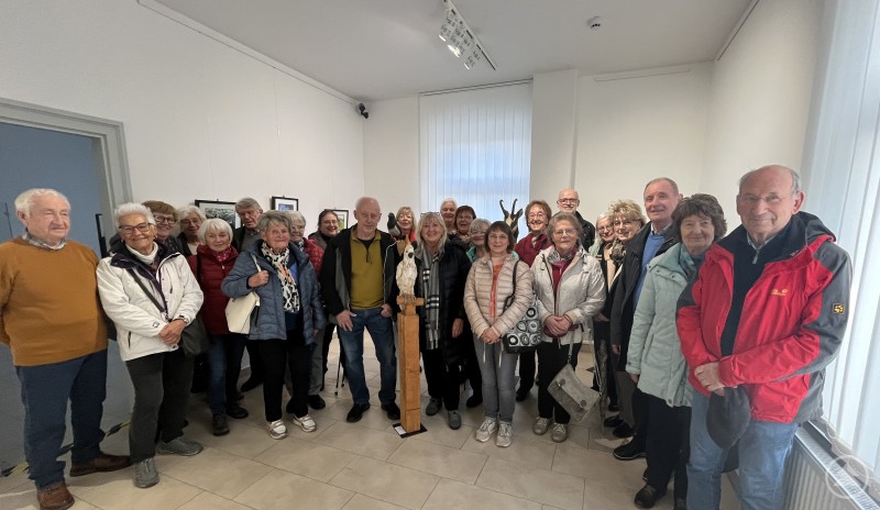 Nach der Führung stärkten sich die Ausflügler in der Schmugglerhütte, bevor es weiter in das Galeriehaus „Kunsträume grenzenlos“ ging. Das denkmalgeschützte Gebäude, ein ehemaliges Postamt aus den 1920er Jahren, wurde 2010 umfassend saniert und 2013 als modernes Kunstzentrum eröffnet. Kurator Fritz Bauer führte die Gruppe durch die Dauerausstellung und die aktuelle Sonderausstellung „Weibliche Perspektiven“ und berichtete über die Entstehung und Bedeutung dieses grenzüberschreitenden Kulturprojekts.
