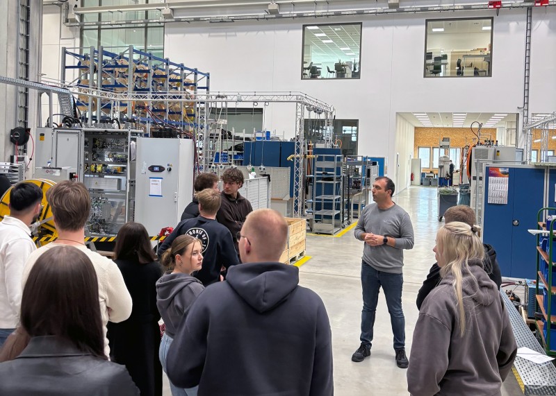 Mehrere Studierende stehen in einer modernen Produktionshalle, während ein Mitarbeiter eines Unternehmens ihnen technische Abläufe erklärt.