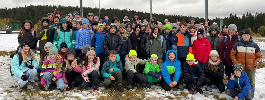 Eine große Gruppe von Schülerinnen und Schülern steht mit ihren Lehrkräften vor einem Schild des Skilanglauf- und Biathlonzentrums Finsterau. Im Hintergrund liegt Schnee, und die Kinder tragen bunte Winterjacken und Mützen.