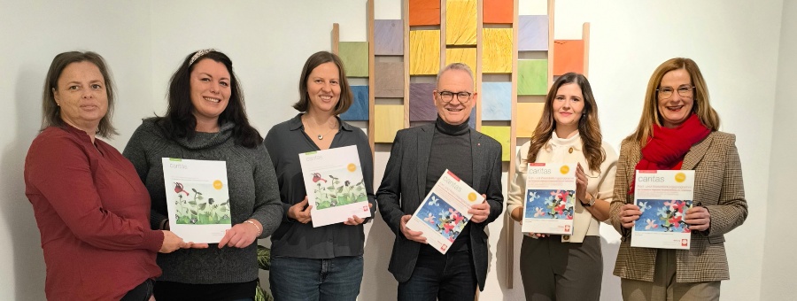 Sechs Personen stehen nebeneinander in einem hellen Raum und halten Broschüren des neuen Caritas-Bildungsprogramms in den Händen. Im Hintergrund hängt ein farbenfrohes Wandbild aus Holz- und Farbfeldern.