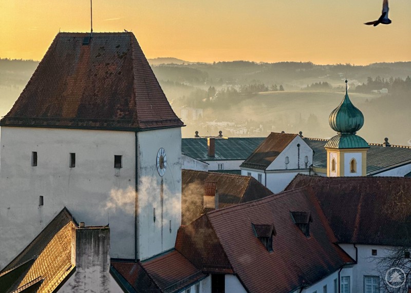 Blick über die Dächer der Veste Oberhaus und umliegende Gebäude in Passau bei Sonnenaufgang; im Hintergrund liegt leichter Nebel über der Hügellandschaft, im Himmel fliegt ein einzelner Vogel.