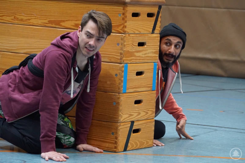 Die Grenze, das ist ein Turnkasten in der Mehrzweckhalle des Landgraf-Leuchtenberg-Gymnasiums; Ahmed und Selim werden von Schauspielern des Jungen Theaters Augsburg dargestellt, das auf Einladung der Schule auf dem Schwaimberg gastierte. Als Bühnenbild genügen ein Kasten, Weichbodenmatte und Basketballkorb.