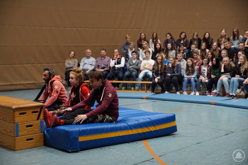 Als in der Turnhalle krachend die Kastenteile zu Boden stürzten zuckten selbst die Zuschauer im „Bombenhagel“ zusammen. So blieb nach dem ausgiebigen Applaus für die beeindruckende Inszenierung und schauspielerische Leistung am Ende viel Betroffenheit über die Schicksale der Protagonisten, die auch aus unserer Mitte hätten kommen können. Besonders wichtig und wertvoll erwies sich daher die Aufarbeitung in den anschließenden Workshops. Den aus Augsburg angereisten, speziell geschulten Theaterpädagogen gelang es im kleinen Kreis der einzelnen Klassen, das Gesehene einfühlsam zu besprechen, zu diskutieren, Fragen zu beantworten.