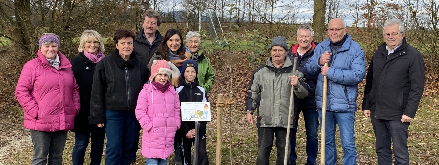 Vertreter von Landkreis, Gemeinde, Schule, Kindergarten und OGV bei der Pflanzung des ersten Generationenbaumes im Landkreis.