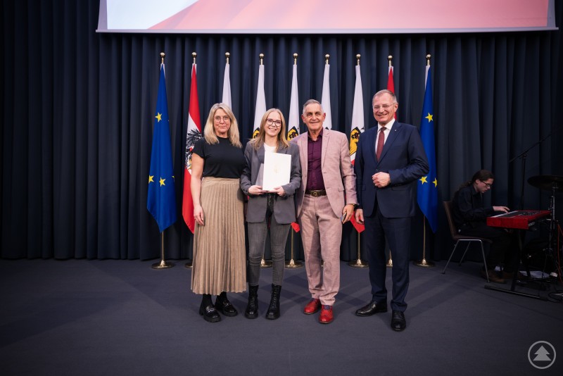 Vier Personen stehen auf einer Bühne vor mehreren EU-, Landes- und Regionalflaggen. Eine junge Frau in der Mitte hält eine Urkunde, die anderen stehen zu beiden Seiten und lächeln in die Kamera.