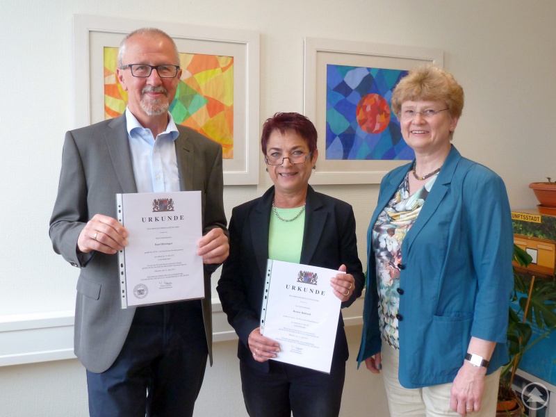 Pünktlich zur Eröffnung der Ausstellung des Deutschen Bundestags in der Aula des Gymnasiums Freyung traf sie ein, die Urkunde, mit der Schulleiterin Barbara Zethner zwei arrivierte Kollegen aus der Fachschaft Sozialkunde – offiziell vom Kultusministerium – in den wohlverdienten Ruhestand verabschiedete.