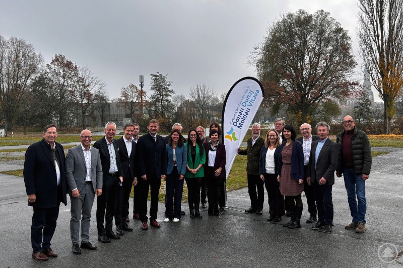 Eine größere Gruppe von Frauen und Männern steht im Freien auf einer nassen Asphaltfläche zusammen. Im Hintergrund sind herbstliche Bäume, ein Funkmast und Gebäude zu sehen. In der Mitte der Gruppe steht eine Beachflag mit dem Logo der Europaregion Donau-Moldau. Die Personen blicken gesammelt in die Kamera.