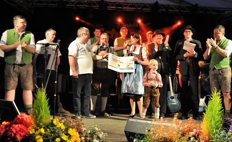 Das Bühnenjubiläum der Schmalzler war vor allem ein Fest mit und für die Fans. Ihren Dank haben diese unter anderem mit einer Spendenübergabe zum Ausdruck gebracht: So hat die „Hilfsgruppe Eifel“ einen 5.000 Euro-Scheck an die Kinderklinik übergeben. „Auch wir möchten den Bau des neuen Eltern-, Baby- und Familienzentrums unterstützen“, so die Stimmen aus dem Fanclub aus der Nähe von Köln, der sich selbst in der Heimat unter dem Namen „Hilfsgruppe Eifel“ für tumor- und leukämiekranke Kinder einsetzt. „In der Nordeifel findet jedes Jahr ein Oktoberfest für einen guten Zweck statt. Seit acht Jahren treten die Schmalzler dort auf und konnten zusammen mit der ‚Hilfsgruppe Eifel‘ bereits die stolze Summe von 80.000 Euro erzielen – davon wollten wir ein wenig an die Heimat der Schmalzler zurückgeben“, so Reiner Züll von der „Hilfsgruppe Eifel“. „Wir haben die besten Fans“, freuen sich die Schmalzler auf der Bühne im vollbesetzten Zelt über die Spenden und bedanken sich für das Engagement der Hilfsgruppe für die Klinik im bayerischen Passau.