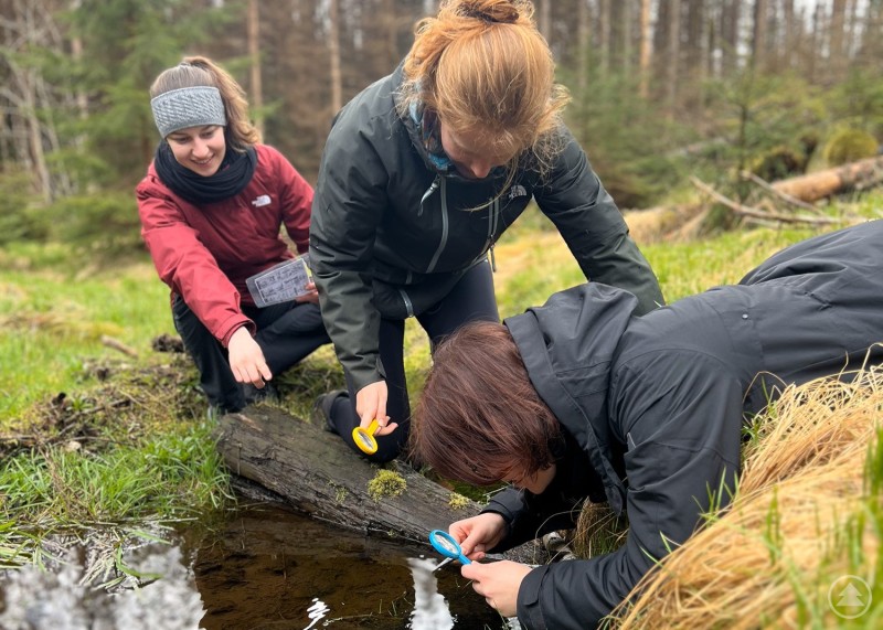 Drei junge Erwachsene arbeiten an einem kleinen Gewässer im Wald; eine Person kniet am Boden und untersucht das Wasser mit einem Messgerät, während zwei weitere daneben stehen und ein Objekt ins Wasser halten.