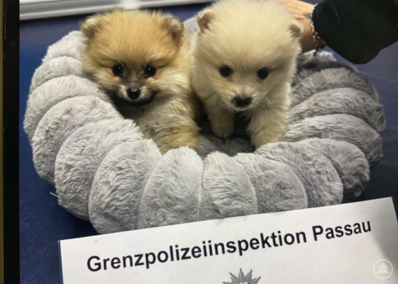 Zwei sichergestellte Zwergspitz-Welpen der Grenzpolizeiinspektion Passau