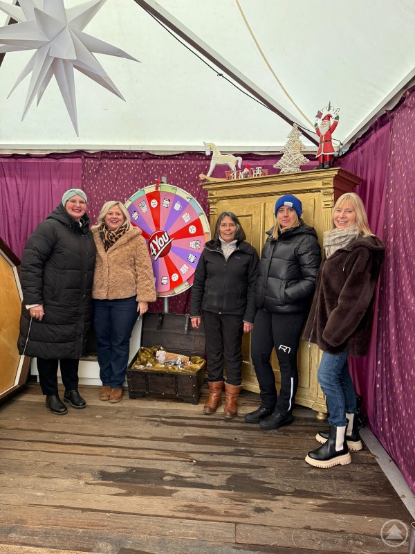 Fünf Frauen stehen gemeinsam in einem festlich dekorierten Zelt mit violetten Vorhängen. Im Hintergrund befinden sich ein großes Glücksrad mit „4You“-Logo, eine goldene Schatztruhe, ein Schrank und weihnachtliche Deko wie ein Weihnachtsmann, ein Schaukelpferd und ein Weihnachtsbaum. Alle lächeln in die Kamera.