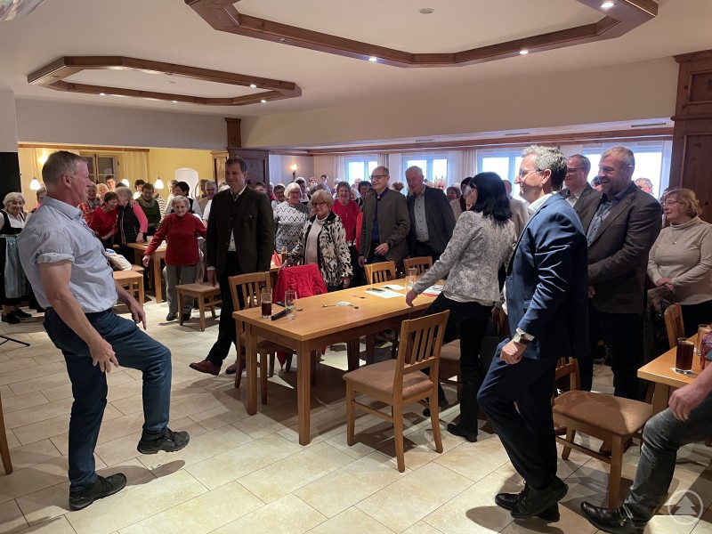Eine große Gruppe von Landfrauen und Ehrengästen steht in einem Saal zwischen Tischen. Im Vordergrund zeigt der Referent Karl Schwanner einige Gleichgewichtsübungen, während ihm das Publikum aufmerksam folgt. Die Stimmung ist freundlich und lebendig.