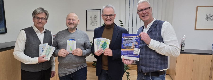 Ein schönes Zeichen der internationalen Solidarität. Kinder aus Thyrnau, Kellberg und Straßkirchen gestalten Weihnachts-Tüten für die Straßen-Kinder in Satu Mare. (V.li.) Die Caritasvorsitzenden Thomas Weggartner (Salzweg/Straßkirchen) und Hans Gottinger (Thyrnau) mit Caritasvorstand Stefan Seiderer und Mario Götz, dem Koordinator der Auslandshilfe.