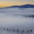 Auf dem Bild ist eine weite Landschaft zu sehen, die fast vollständig von dichtem Nebel bedeckt ist. Aus dem Nebel ragen die Spitzen von Nadelbäumen hervor, im Hintergrund sind sanfte Hügel oder Berge erkennbar. In der Ferne sticht ein Kirchturm aus dem Nebel heraus, darüber ein ruhiger Himmel in warmen Farben der Morgen- oder Abenddämmerung.