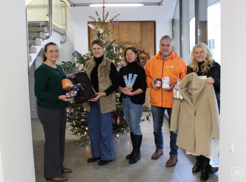 Fünf Personen stehen in einem hellen Eingangsbereich vor einem geschmückten Weihnachtsbaum. Sie halten gespendete Kleidung und Lebensmittel in den Händen und lächeln in die Kamera.
