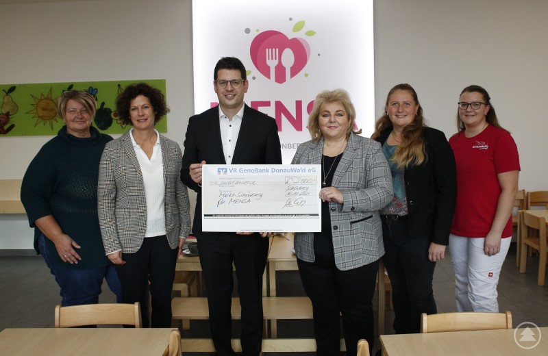 Mit einem lachenden und einem weinenden Auge nahm Bürgermeister Martin Pichler eine Spende der VR GenoBank DonauWald eG für die Schönberger Kinder-Mensa entgegen. Zwar beendet die Bank ihre räumliche Präsenz mit eigener Filiale oder Servicestation am Marktplatz, dem Markt Schönberg möchte sie dennoch eng verbunden bleiben. Ausdruck dessen ist eine Spende in Höhe von 2000 Euro für die Mensa der Markt-Kinder.